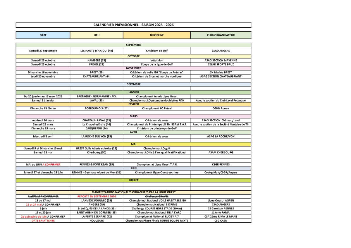 Le calendrier| Ligue Ouest Fédération des Clubs de la Défense